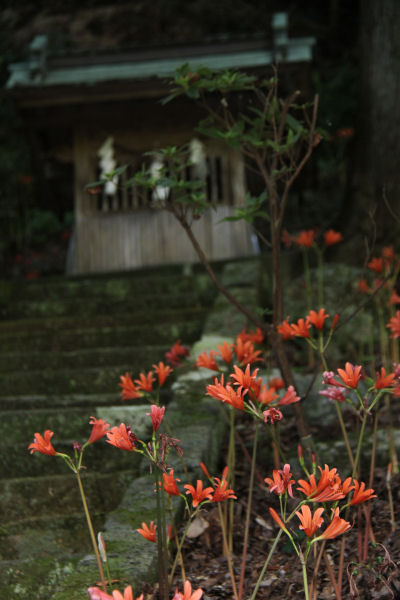 - 八木山の八幡神社では、キツネノカミソリが鮮やかなオレンジ色の花を咲かせています。