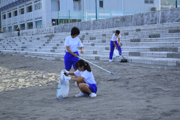 - 早朝の松崎海岸では、中学生や観光関係者、一般ボランティアが清掃活動を行っています。