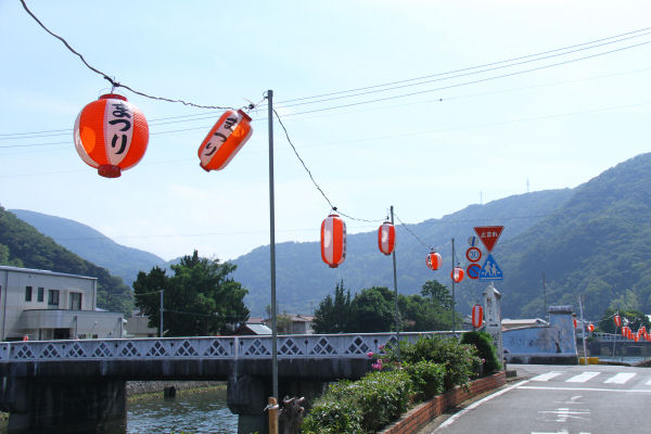 - 松崎地区では夏まつりの準備が進み、現在、那賀川沿いに提灯が設置されています。