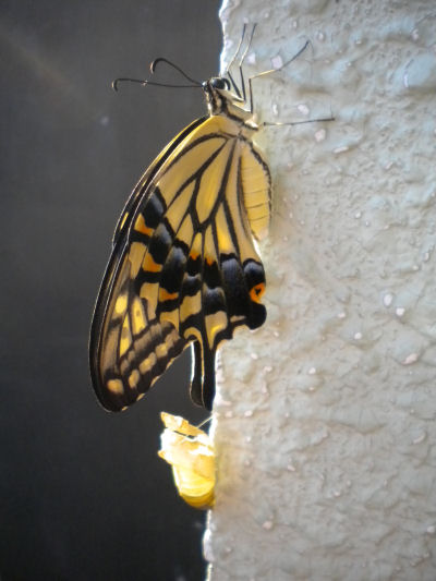 - 今朝、キアゲハがサナギから羽化し、羽を大きく広げているところに出会いました。