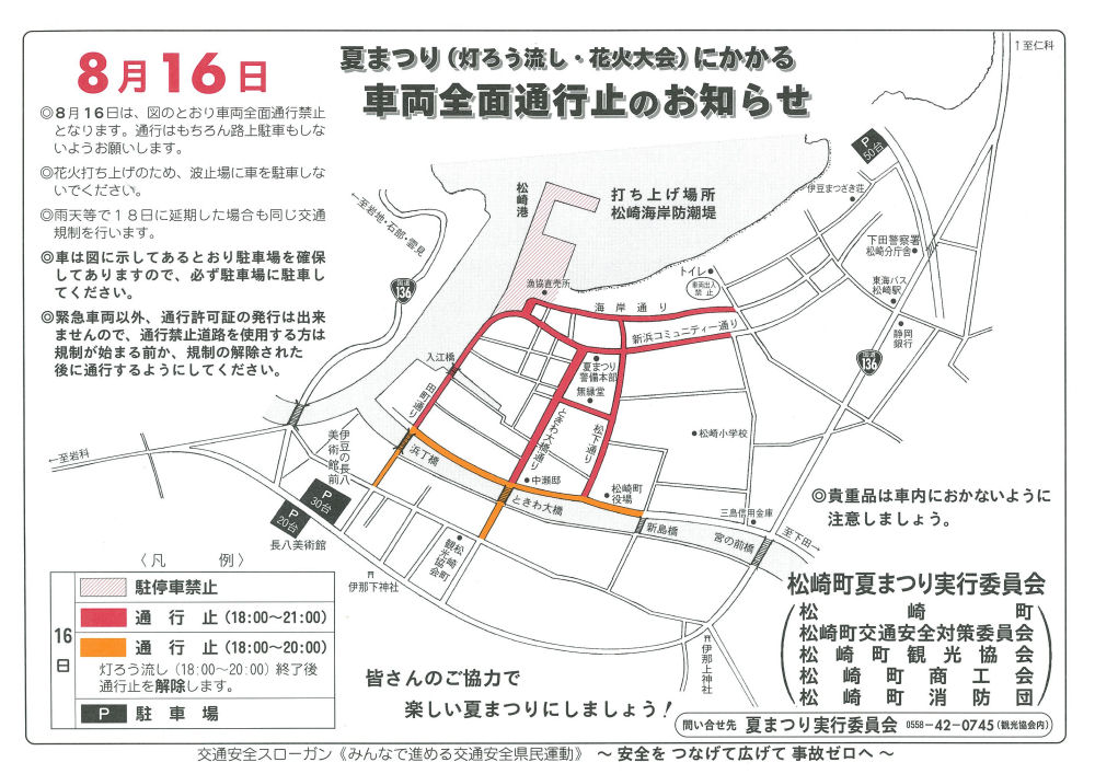 - 松崎地区では、16日(日)に予定されている夏まつりの際の交通規制の周知看板が設置されています。楽しい夏まつりにするため、皆様のご協力をお願いします。