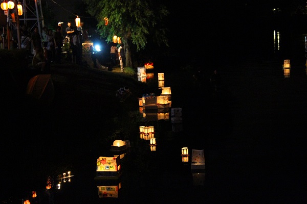 - 松崎海岸花火大会前には、中瀬邸前を流れる那賀川において、灯ろう流しが行われました。一列に川を流れる灯ろうが、幻想的な風景を映し出しました。