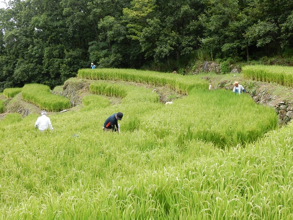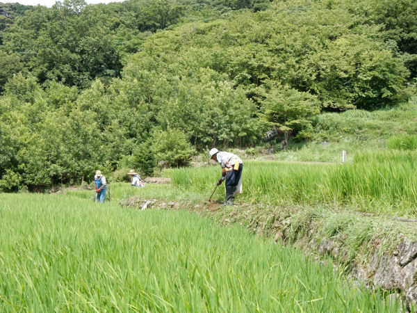 - 石部棚田では、石部棚田保存会による畦の草刈り作業が行われました。