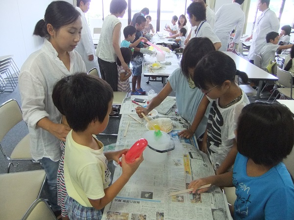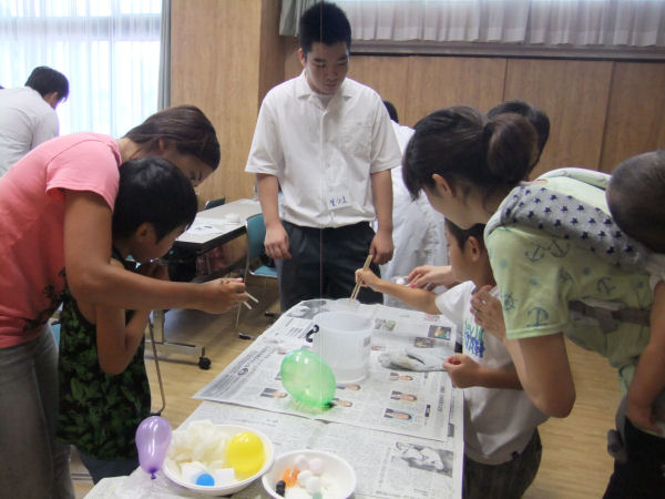- 昨日に引き続き、生涯学習教室の一環の理科の実験教室が開催されました。 液体窒素を使っていろいろな物を凍らせ、普段では体験することがない実験に参加者たちは楽しんでいました。