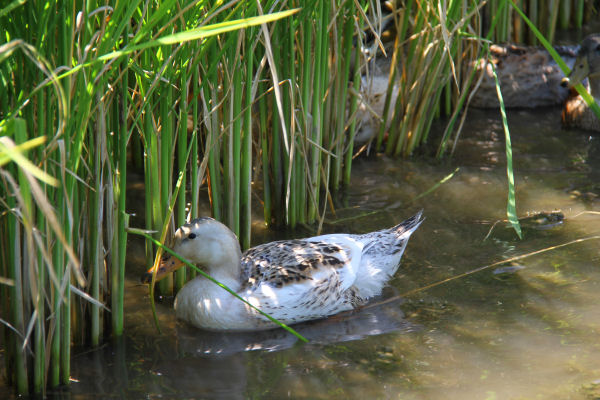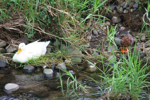 - 岩科川に住んでいるアヒルです。今日はカモと一緒に川原で休んでいました。