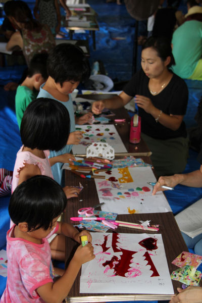- 昨日の話題ですが、船田区の帰一寺にて、灯ろうに張るイラストを描くイベント「おてらでおえかき」が開催され、多くの親子連れが参加しました。