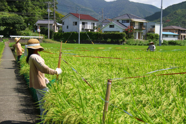 - 町内の田んぼではかかしが設置され、穂がついた稲を鳥獣から守っています。