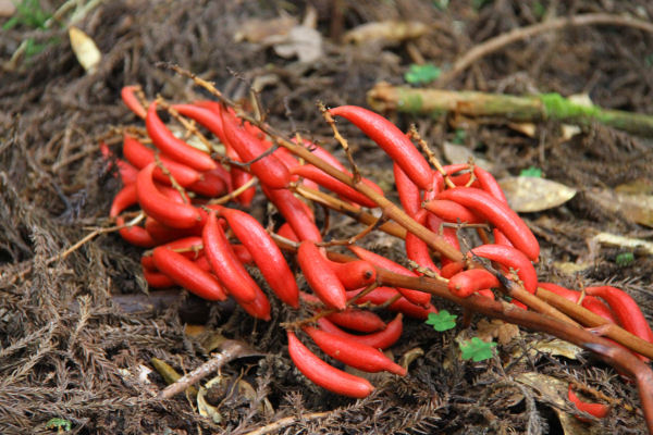 - 町内の山間部にて、ツチアケビを見つけました。緑や茶色が多い山の中では、赤い実がとても目立っています。