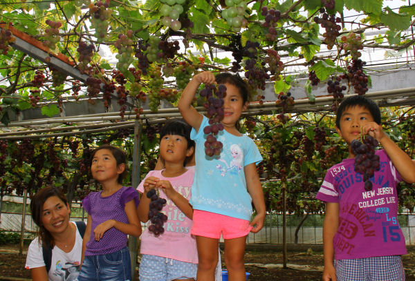 - 岩科地区八木山にある八木山健康農園では、8月下旬から9月下旬頃までブドウ狩りを楽しむことができます。今日は、地元の子どもたちを招待して、ブドウ狩りを楽しんでいただきました。
