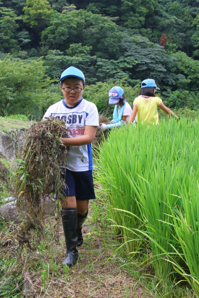 - 棚田百笑くらぶでは、8月の活動として、刈り草の片付け作業を行いました。 参加した子どもたちは、石部棚田保存会が刈っておいた畦の草をみんなで協力しながら1か所に集めました。