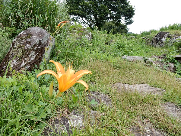 - 町内各所でノカンゾウが目立つようになりました。写真は石部棚田の石畳の道の脇に咲いているノカンゾウです。