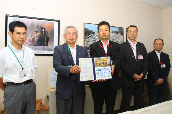 - オリジナルフレーム切手「伊豆の長八生誕200年記念」が明日から発売が開始となります。今日は、松崎郵便局長から町長へ切手の贈呈が行われました。