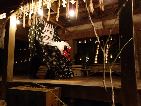 - キャンドルで照らされた峰地区の津島神社では、奉納神楽(下り端の舞)が行われました。神楽は1月1日の午前0時から毎年行われる伝統行事です。