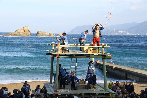 - 雲見海岸では、漁業の安全と豊漁を祈願する新春恒例の乗り初めが行われました。西風が強く吹き、砂の舞い上がる天気となりましたが、海岸に設置されたやぐらからまかれるお菓子やお餅を拾おうと多くのお客様が訪れました。