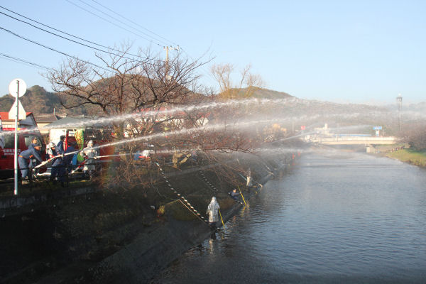 - 式典後は、消防団ラッパ隊や団員、消防車が町内をパレードしました。パレードの後は、那賀川沿いで、一斉放水が行われました。
