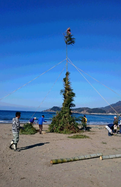 - 松崎海岸では、地区の有志の方が集まり、さいの神作りが行われました。このさいの神に正月飾りや書初め等を付け、1月10日(日)午前8時30分にどんど焼きが行われます。
