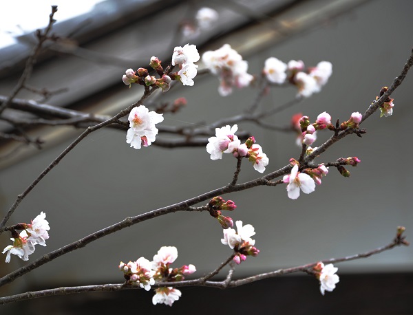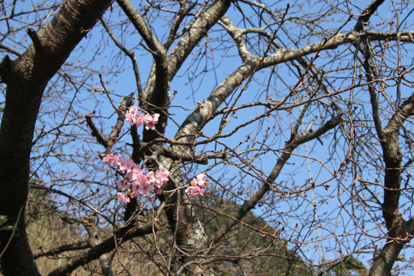 - 冬にしては暖かい気候が続いているためか、道部区にある早咲きの桜の一部の枝が、早くも花を咲かせていました。