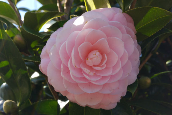 - 町内では、八重咲きのサザンカが花を咲かせています。淡い桃色の花びらが可愛らしいです。