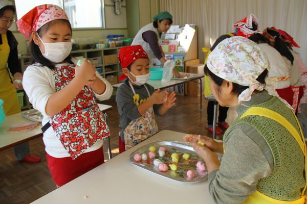 - 松崎幼稚園岩科園では、どんど焼きのお団子作りが行われました。園児たちは、赤や白、緑色等に着色された生地で、花や雪だるま等の団子を作りました。作ったお団子は持ち帰り、各家庭や各地区のどんど焼きで食べる予定です。