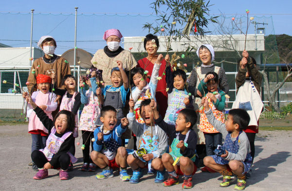 - 松崎幼稚園中川園でもどんど焼きのお団子作りが行われました。風が強いため、どんど焼きは行えませんでしたが、園児たちは地域の人たちに教えてもらいながら団子を作り、木の枝にさしました。