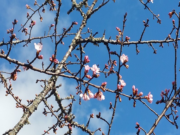 - 暖かい日が続いたためか、建久寺地区にある早咲きの桜も花を咲かせ始めています。