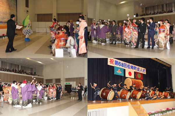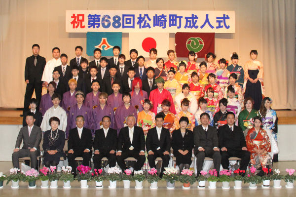 - 環境改善センター文化ホールにて、第68回松崎町成人式が行われました。第1部の式典では、町長や議長から新成人へお祝いの言葉があり、新成人代表からは宣誓が行われました。