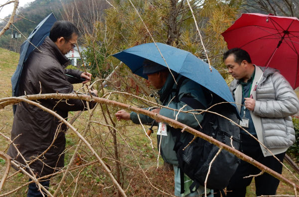 - 本日、静岡県くらし・環境部環境ふれあい課の事業の一環である桜の巡回指導が行われました。花の三聖苑に樹木医の水戸喜平氏が訪問し、三聖苑内の桜を診ていただきました。