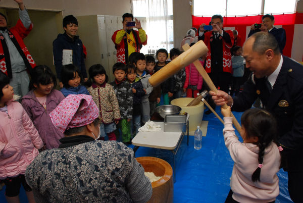 - 下田警察署松崎分庁舎にて、聖和保育園の園児が参加し、交通安全餅つき大会が開催されました。園児たちは大人に補助してもらいながら杵を使って餅をつき、できたお餅はその場で食べたり、持ち帰りました。
