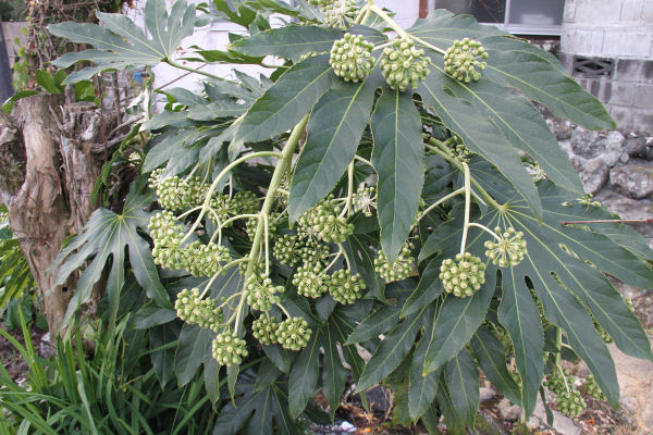 - 町内でヤツデを見つけました。ヤツデは葉が大きく独特の形をしており、テングノハウチワとも呼ばれています。