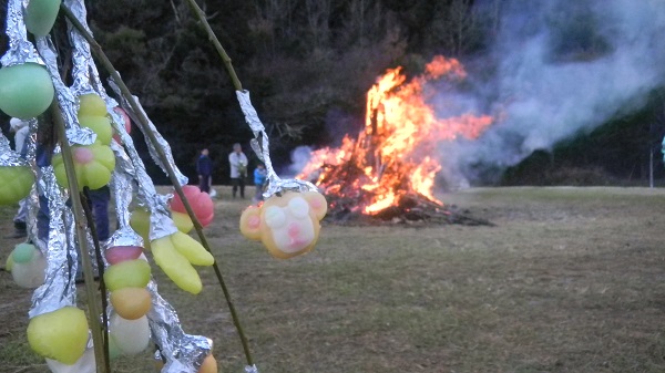 - 峰地区では、五穀豊穣や無病息災を願い、正月飾りなどを燃やすどんど焼きが行われました。木の枝につるして焼いて食べる団子の中には、今年の干支にちなんだサルの団子もありました。