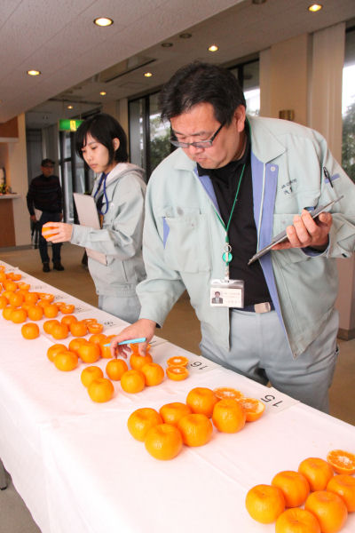 - 環境センターロビーでは、松崎町の特産品であるポンカンの品評会が開催されました。今日は、出品されたポンカンの審査が行われました。表彰式は明日行われます。