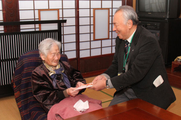 - 本日、100歳を迎えた髙橋まつさんの自宅に齋藤町長が訪問し、お祝いしました。髙橋さんは町長からの激励に「ありがとうございます」と笑顔で答えていました。